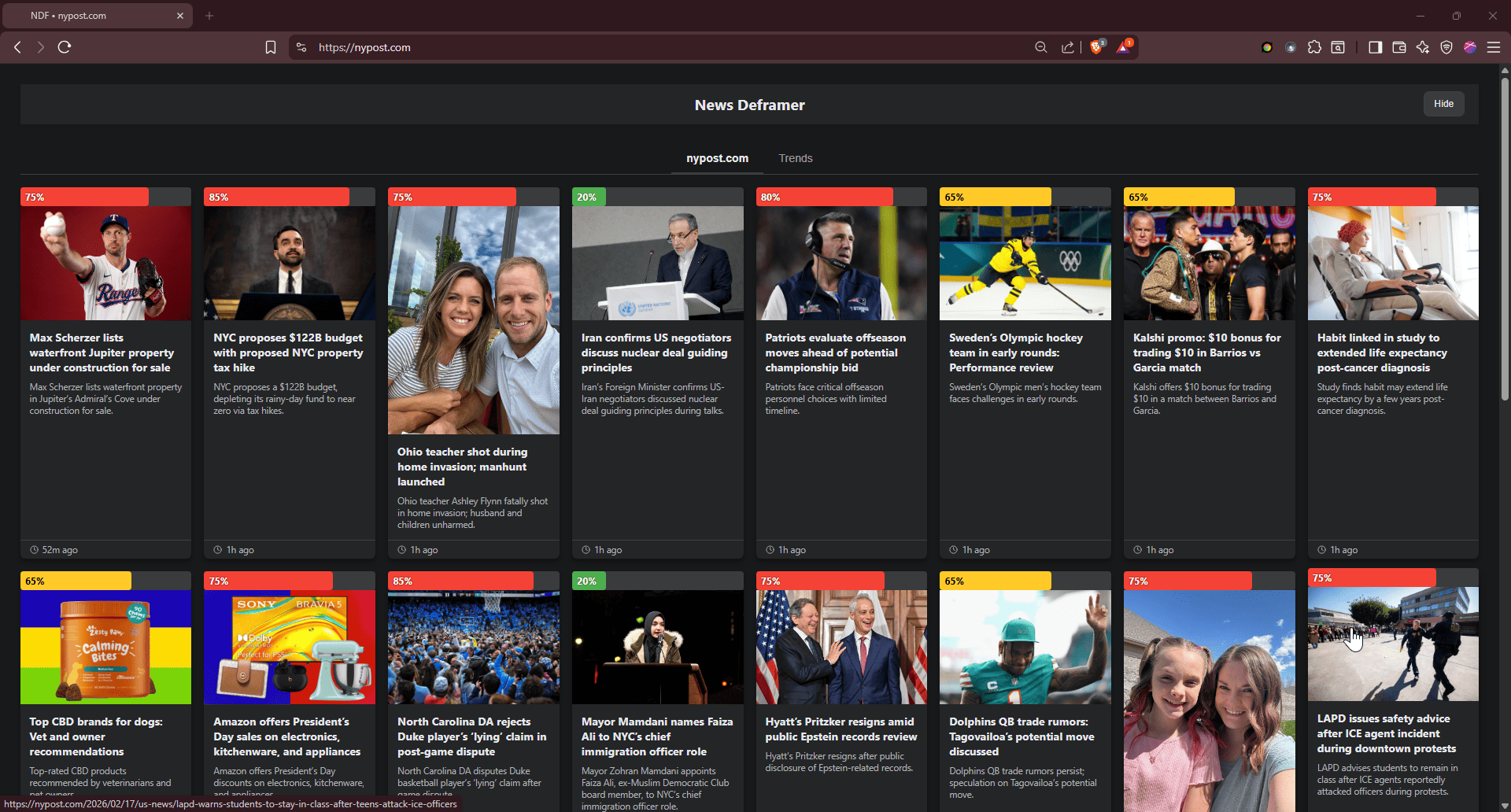 An ad blocker removes unwanted advertisements. News Deframer reduces the mental impact of clickbait by replacing the portal page of major news networks with neutral wording.