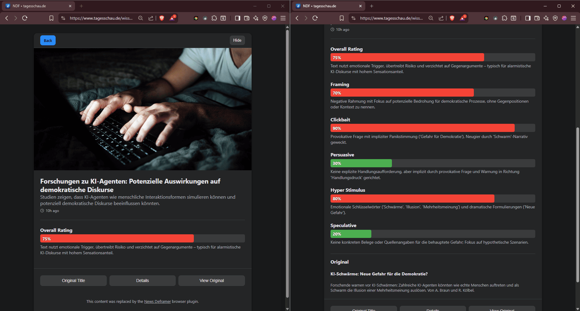 - Vergleich: Eine bekannte Quelle in der gewählten Sprache kann mit einer anderen Quelle verglichen werden. Die Ansicht zeigt zentrale Themen, identifiziert blinde Flecken einer Quelle und hebt gemeinsame Schwerpunkte beider Quellen hervor.
